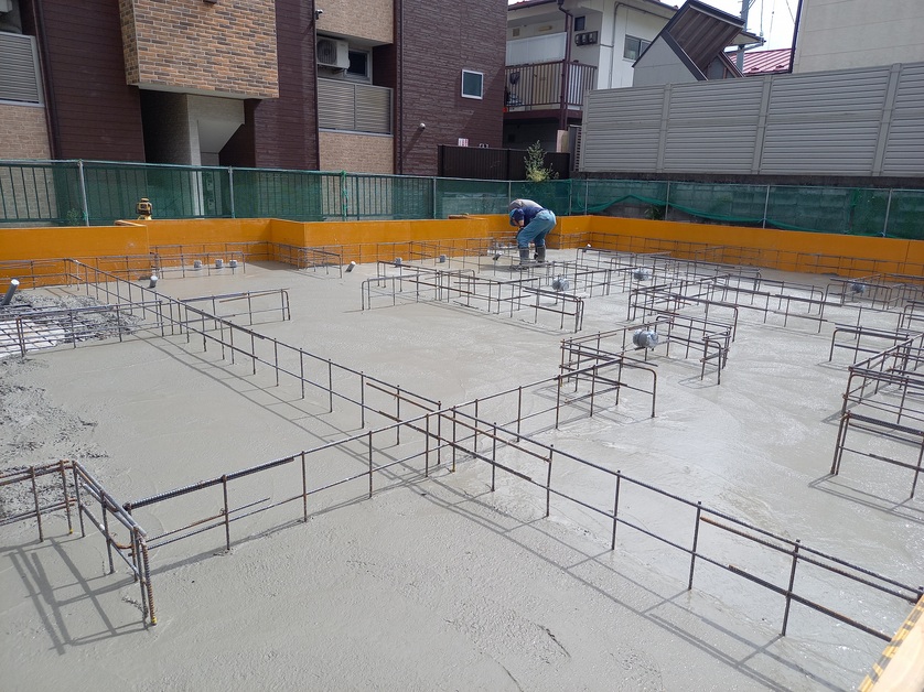 配筋後にコンクリート打設を行い、基礎の土台をしっかり構築しています。